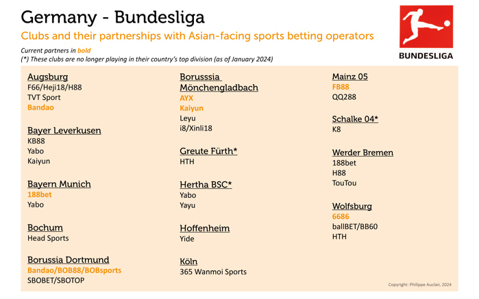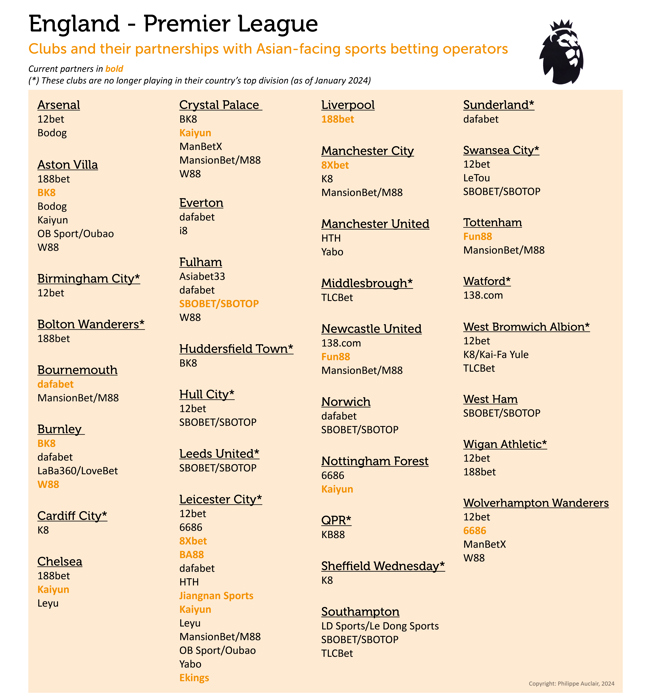 This list was compiled over a year from open-source material, industry publications, and internal club communications. It features many partnerships which have never been made public in Europe, as many clubs shun the adverse publicity they could get from associating with brands which operate on the fringe of legality (or outside it) in their target markets in Asia.