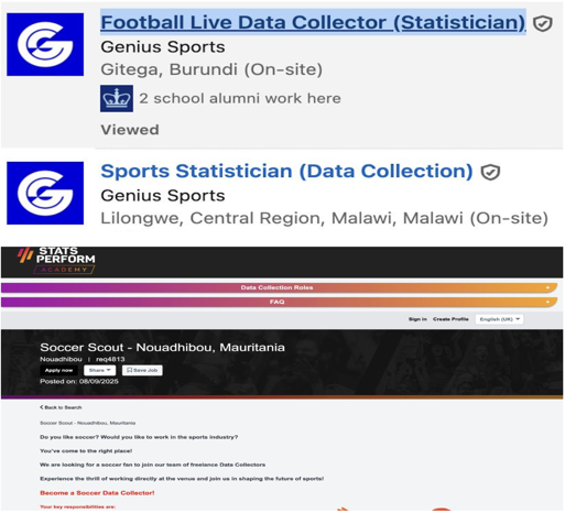 Play the Game found that Stats Perform has a vacancy in Mauritania; Genius Sports recruits ‘football data collectors’ or ‘sports statisticians’ in Burundi, Malawi, Liberia, Tanzania and Curaçao. In the past, Genius Sports also hired scouts in Ethiopia, Niger and Burundi.