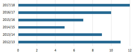 Another of Europe’s longest running hegemonies was also broken in 2016/17, when Rijeka displaced Dinamo Zagreb as Croatian champions for the first time since 2004/05. However, Rijeka appeared in the 1999/00 Champions League qualifiers after finishing in second in the Croatian league and taking one of the two places then on offer to the Balkan country.