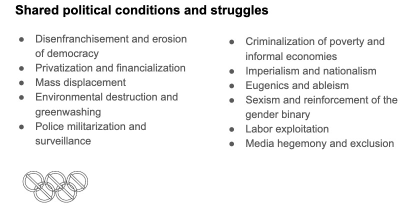 Image from NOlympics LA. List of “shared political conditions and struggles” informed by conversations in Tokyo.