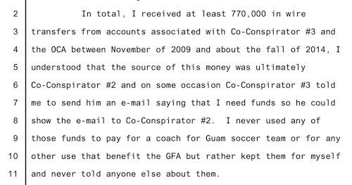In April 2017, the U.S. Department of Justice (DOJ) released the indictment against AFC official Richard Lai of Guam as part of the huge FIFA case. Lai had received about one million dollars in bribes from officials called co-conspirators in the indictment.
