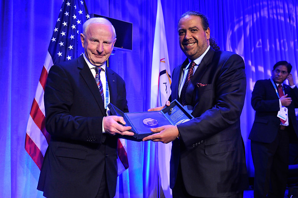 ANOC Senior Vice President Patrick Hickey presents ANOC President Sheikh Ahmad Al-Fahad Al-Sabah with an award at the the XX ANOC General Assembly 2015. Photo: Larry French/Getty Images.