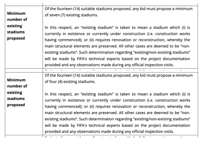 The 2030 and 2034 hosting requirements reduced the number of required existing stadiums from seven to four, favouring Saudi Arabia.