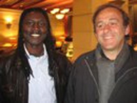 Photo: Michael Essien (left) with Wilson Raj Perumal. For example, at the end of the confidential FIFA South Africa report are two extraordinary photos. The first is Wilson Raj Perumal – the man responsible for getting the fixers into the South African Football Association – standing beside Michael Essien an international star-player for Ghana, Chelsea and now AC Milan. The second photo is of Gaye Alassane, one of the runners for the Dan Tan group, was arrested in Singapore, with the man who heads up European soccer – Michel Platini.