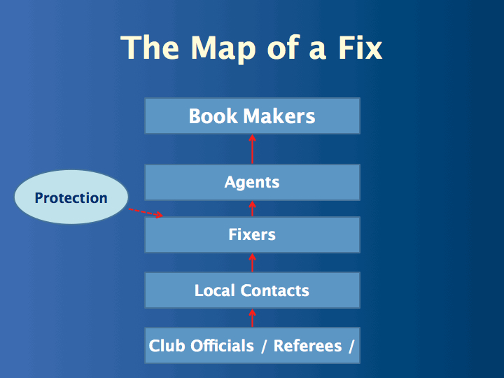 The fixers do not have an established hierarchy like traditional American organized crime: there are no Capos, Consiglierei or foot soldier ranks. Rather the model, according to interviews with the fixers and their associates, is more like a shark frenzy. At the bottom rung are ‘runners’ – low agents who literally run back and forth between the players/referees/officials and the actual fixer who is betting the money on the fix. In the international fixes these fixers defraud the gambling market – the vast, unregulated sports betting world run out of Asia. Their local partners - in Europe, Africa, Latin America or Australia – fix the actual games by working essentially as their runners.