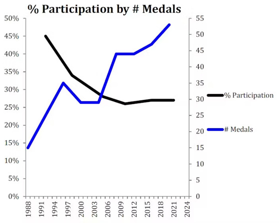 Figure 2: Canadian participation in sport compared to the number of medals won by Canadian athletes
