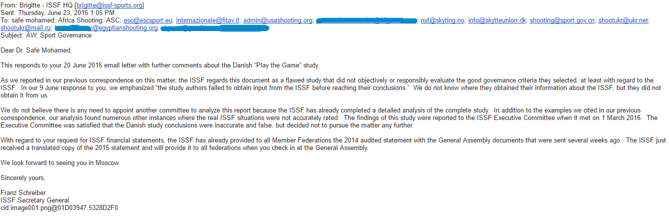 “[T]he ISSF regards this document [the SGO study 2015, ed.] as a flawed study that did not objectively or responsibly evaluate the good governance criteria they selected, at least with regard to the ISSF. In our 9 June response to you, we emphasized ‘the study authors failed to obtain input from the ISSF before reaching their conclusions’. We do not know where they obtained their information about the ISSF, but they did not obtain it from us.