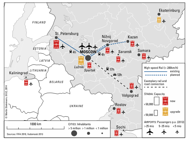 The largest part of the USD $21 billion, however, is scheduled to flow into various transport projects required for hosting the event: airport upgrades and links between the airports and the stadia. In addition, Russia will have to build 86 training bases, among others for the national teams.