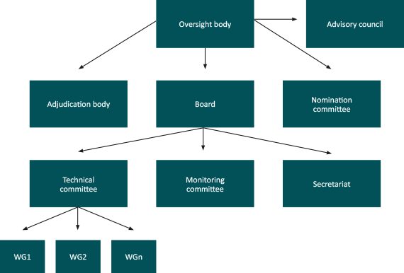 We drew inspiration from organisations with similar functions, such as the International Organization for Standardization (ISO), the International Accounting Standards Board (IASB), and the International Labour Organization (ILO), to outline a potential governance structure.