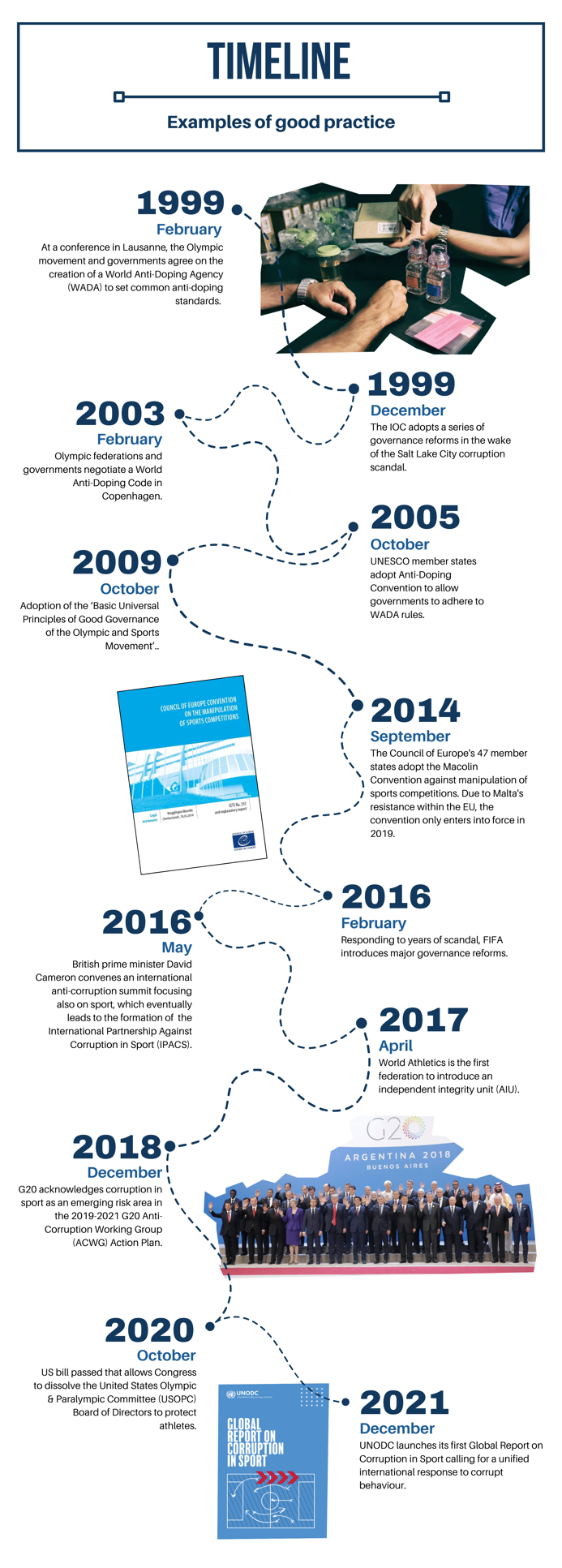 These challenges continue in part because actors are not united by universal minimum standards that comprehensively address crime, corruption, and other breaches of integrity in sport.