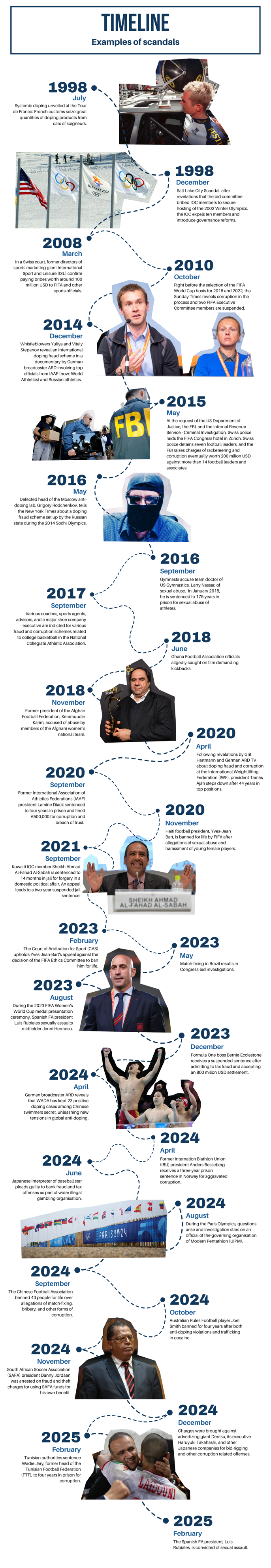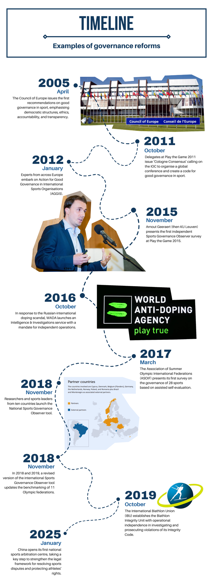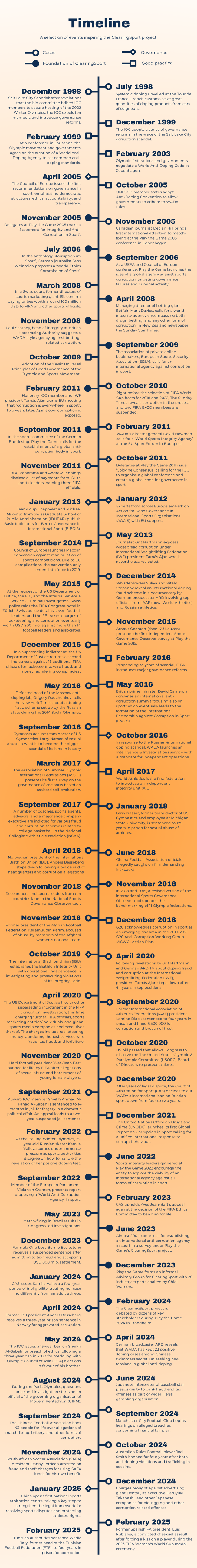 We have further sub-labelled the timeline into four categories of examples: cases, foundation of ClearingSport, governance reforms, and good practices. See the full timeline below and find the four thematic timelines in the bottom of the page.